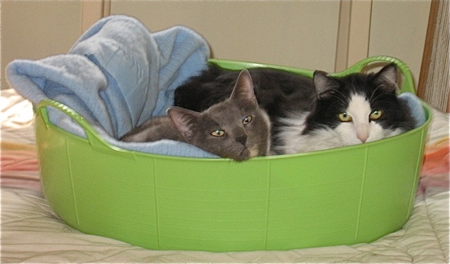 It's also hard to get pictures of the cats sleeping because cats sleep with one eye open, or at least that is what I have been told. So whenever Mom tries to get a picture of the cats sleeping, they wake up before she can even get her camera turned on. But anyway, sometimes Charlie and Chloe sleep together in the green plastic tub. They didn't do that last summer because I think it was too hot, but they do it a lot in the winter.